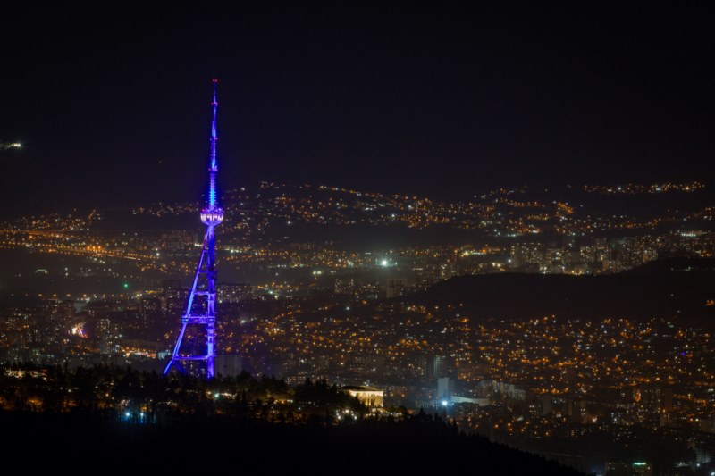 Tbilisi TV Broadcasting Tower Illuminated in EU Flag Colors